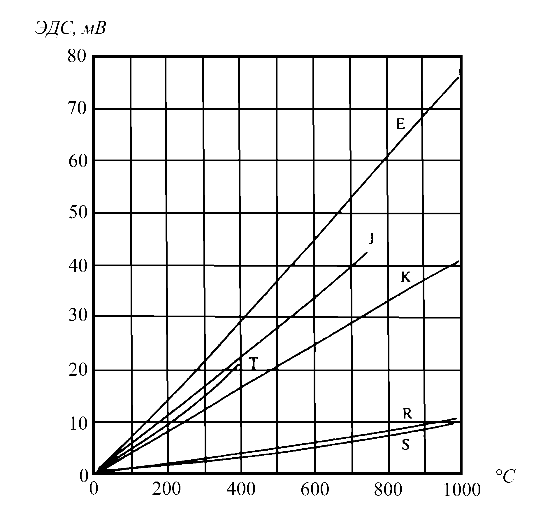 Рис. 2.42. Зависимость термоЭДС стандартных термопар от температуры