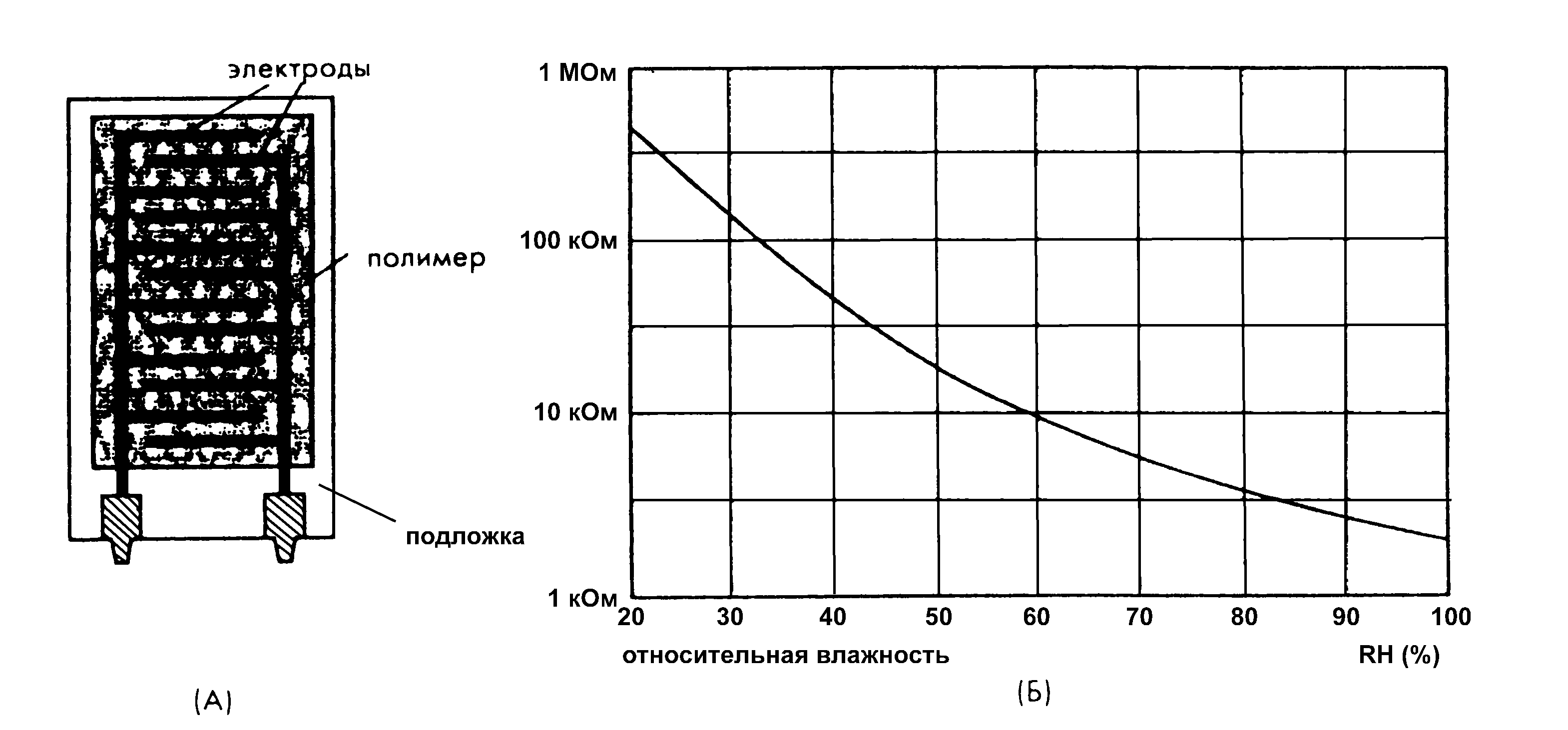 Гигристоры преобразуют изменение влажности в изменение сопротивления. Внешний вид гигристора и его функция преобразования показаны на рисунке 2.25.