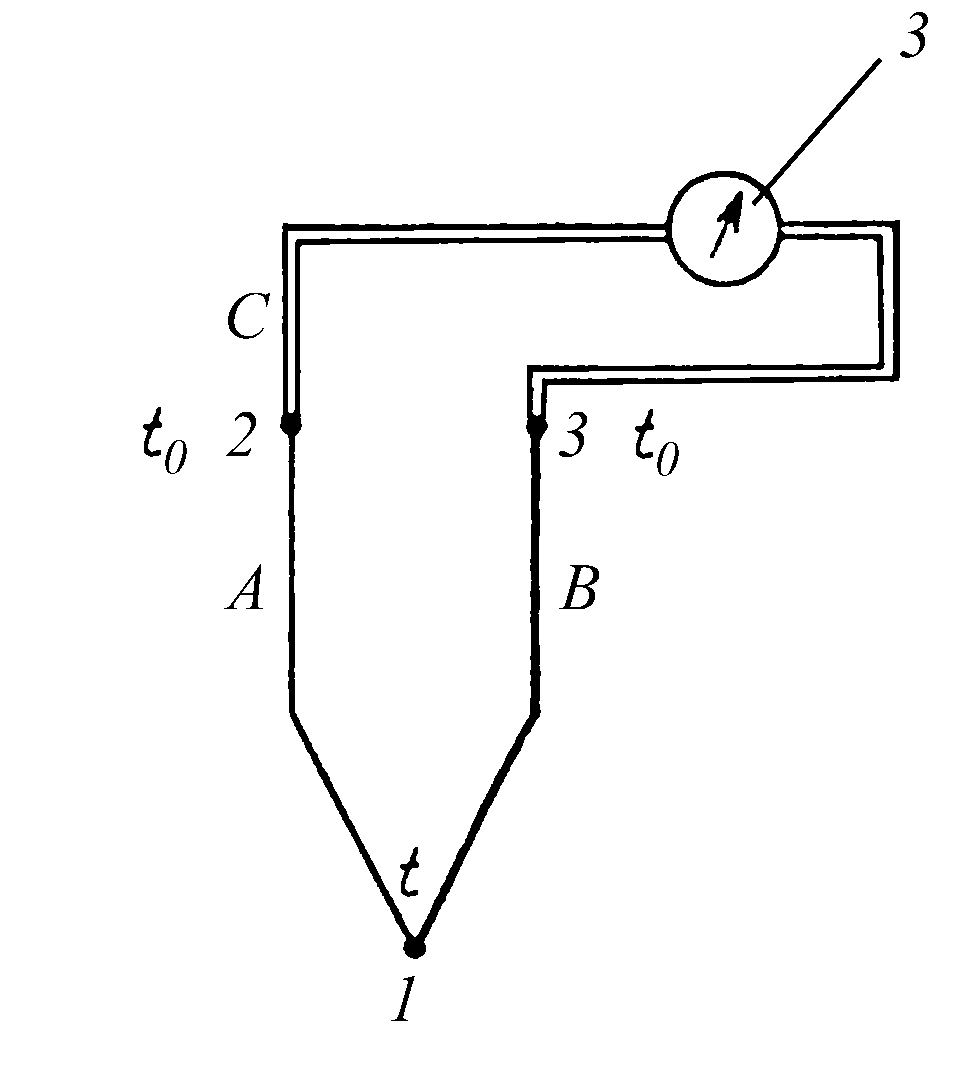 Рабочей спай 1 погружен в объект с температурой t, а два свободных спая 2 и 3 подключены проводом C к измерительному прибору 3. Температура свободных спаев t0. Измерение температуры t возможно лишь при достаточно точно известной температуре t0. Создаваемая термопарами ЭДС сравнительно невелика: она не превышает 8 мВ на каждые 100 °С и обычно превышает 70 мВ.