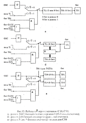 Значение бита С/Т (TMOD.6 или-ТМООЗ) определяет работу в режиме Т или СТ. При С/Т=0 - работа в режиме таймера с запуском от внутренней схемы синхронизации с частотой OSC/12, при С/Т=1 - работа в режиме СТ с запуском от внешних сигналов на входах.ТО или Т1 (рис.9).