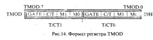 Управленце Т/СТ осуществляется регистрами режима TMOD с адресом 89Н и управления/статуса TCON с адресом 88Н. Эти регистры входят в область RSEG.