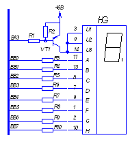 Семисегментные индикаторы подключены к выходам инверторов. Индикаторы работают в динамическом режиме, зажигаясь поочередно с большой частотой. Глаз человека не успевает следить за быстрыми переключениями и расценивает это как постоянное свечение. Для переключения индикаторов применены транзисторные ключи, в коллекторной цепи которых подключены аноды индикатора. Поочередно подавая сигнал "0" на базу транзисторов VT2-VT7 (КТ501В) можно поочередно включать индикаторы.