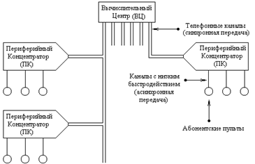 Во-вторых, по быстродействующему каналу передается совокупность стартстопных сигналов. Это может оказаться неэффективным. Так, если оператор делает паузу в момент между нажатием клавиш на абонентском пульте, канал будет занят на протяжении всей этой паузы. Поэтому лучше иметь в концентраторе соответствующие буферные устройства, а по быстродействующему каналу использовать более эффективную синхронную передачу. В-третьих, по быстродействующему каналу можно посылать условные символы, которые сокращали бы передачу. Если концентратор сделать программно управляемым, то многие элементы информации, связанные, например, с ведением диалога человека с машиной, можно разместить в концентраторе, не передавая их вычислительной машине.