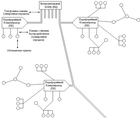 На рис. 1.2 показаны концентраторы с групповыми (многопунктными) линиями с низким быстродействием. При таком размещении большое количество абонентских пультов с низким быстродействием, разбросанных на значительной площади, могут подсоединяться к вычислительной машине с помощью одного обычного телефонного канала.