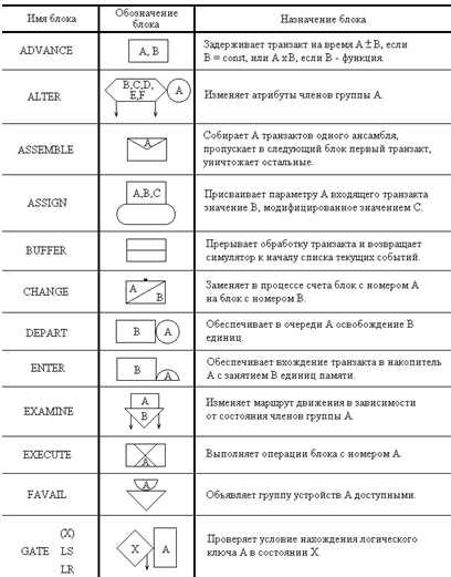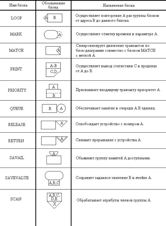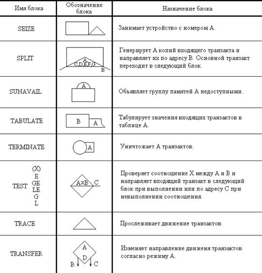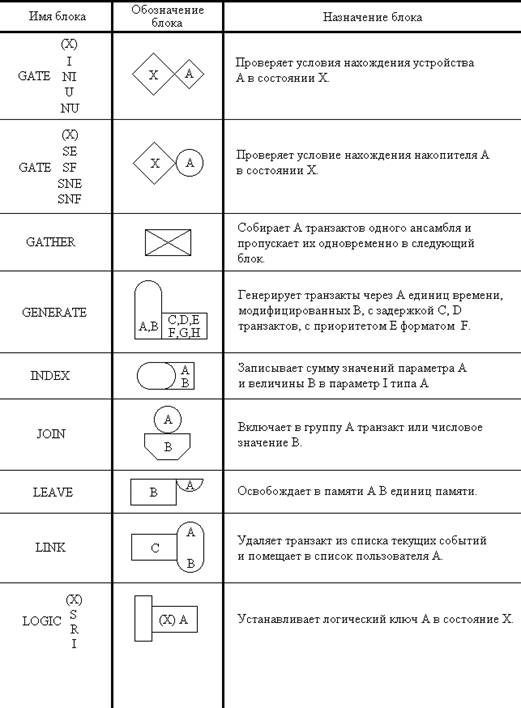 Таблица 2.1 Условные обозначения блоков GPSS