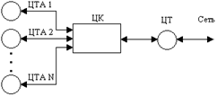 Сети ISDN доставляют различные виды информации (оперативные данные и файлы ЭВМ, речь в цифровой форме, факсимильная информация и т.д.) [6]. В данной программе рассматривается фрагмент такой сети в виде системы передачи цифровой информации, обеспечивающей процесс взаимодействия цифровых телефонных аппаратов (ЦТА) с цифровым концентратором (ЦК), который представляем собой устройство, обеспечивающее сопряжение входных низкосортных цифровых каналов связи от каждого ЦТА с выходным высокоскоростным цифровым трактом (ЦТ). В общем случае имеется N цифровых телефонных аппаратов, подключенных к цифровому концентратору, который осуществляет мультиплексирование входящего потока цифровой информации и его дальнейшую передачу по цифровому тракту (рис. 3.1). Каждый цифровой тракт состоит из шести уплотняемых каналов (кадров). При нормальных условиях функционирования (когда загрузка цифрового тракта меньше 80%) используются пять каналов, в случае временного увеличения загрузки цифрового тракта больше 80% подключается дополнительный канал на время пика нагрузки. Нагрузка по вызовам, создаваемая одним цифровым телефонным аппаратом, составляет 0,1 Эрланг, а вероятность обслуживания любого вызова равна 0,4. Не обслуживание вызова может произойти в результате занятости абонента (время прослушивания сигнала "Занято" равно 15 с) или его отсутствия с равной вероятностью. При отсутствии свободного канала вновь поступивший вызов блокируется. Не обслуженный вызов становится источником повторных вызовов.