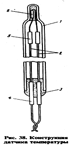 Один из выводов диода 6, используемого как датчик, следует подогнуть к его корпусу, к обоим выводам подпаять два провода 2 марки МГТФ-0,07 длиной по 0,5 м, одеть на каждый из них по два отрезка (4 и 5) поливинилхлоридной или фторопластовой трубки. Диод с проводами вставить в стеклянную трубку и закрепить провода в ее открытом конце каплей эпоксидного клея 3. Для улучшения теплового контакта трубки и диода перед сборкой датчика в утонченную часть трубки с помощью тонкой трубки ввести небольшое количество жидкого масла, например моторного.