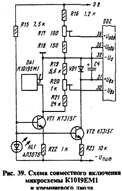 Решением проблемы, связанной с нестабильностью опорного напряжения, может быть одновременное использование двух рядом расположенных датчиков - микросхемы К1019ЕМ1 и кремниевого диода. На рис. 39 приведена возможная схема их совместного включения.