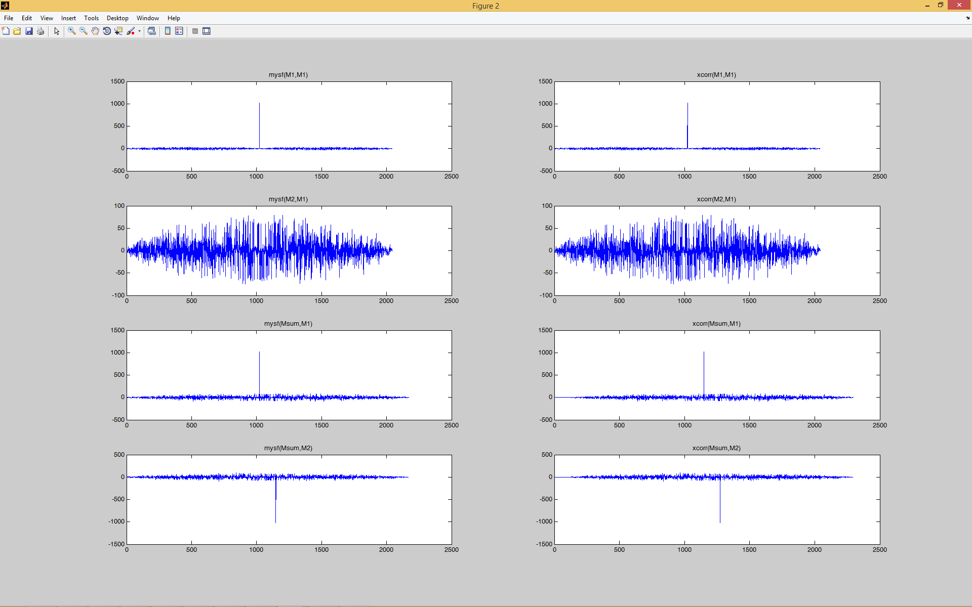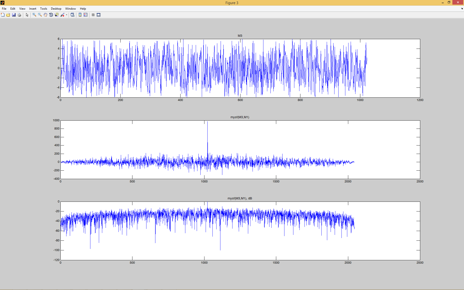Построить автокорреляционную функцию – АКФ для М1, т.е. М1 – сигнал, и М1 –опорная функция, с помощью функции my_sf.