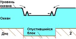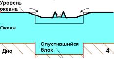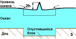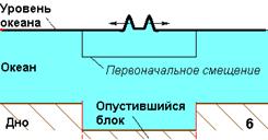 Момент землетрясения. Опустился блок на дне, колонна воды потеряла опору. По краям блока образовываются две волны, бегущие навстречу. |