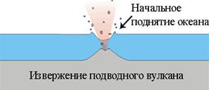 При землетрясении происходит сдвиг вверх или вниз протяжённых участков дна. В силу малой сжимаемости воды и быстроты процесса деформации участков дна опирающийся на них столб воды также смещается, не успевая растечься, в результате чего на поверхности океана образуется некоторое возвышение или понижение. Образовавшееся возмущение переходит в колебательные движения толщ воды - волны цунами. Пусть при землетрясении под водой образовалась вертикальная трещина, и часть дна опускается. Дно внезапно перестает поддерживать столб воды, лежащий над ним. Поверхность воды приходит в колебательное движение по вертикали, стремясь вернуться к исходному уровню, - среднему уровню моря, - и порождает серию волн.