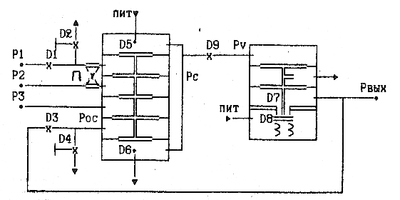 Рис. 4. Схема операционного усилителя, построенного на пневмоэлементах УСЭППА