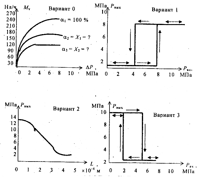 На рис. 1 представлены статические и динамические характеристики элементов и модулей пневматических ТСА. Приведите конструктивную схему и опишите принцип действия элемента или модуля Вашего варианта. Найдите математическое описание характеристики, определите рабочий диапазон использования устройства и числовые значения коэффициентов в нем. Оцените погрешность аппроксимации характеристики, которая будет обеспечена для рабочего диапазона при использовании приведенного математического описания. Для повышения точности вычислений рекомендуется перестроить график Вашего варианта с увеличением масштаба, сохраняя при этом все нелинейности характеристик.