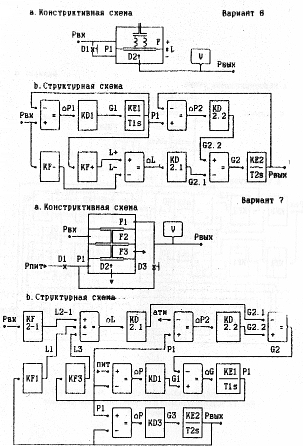 На рис. 713 представлены конструктивные и структурные схемы модулей, собранных из пневматических элементов. Найдите уравнения статики, передаточные функции или уравнения динамики для всех звеньев, входящих в схему Вашего варианта.