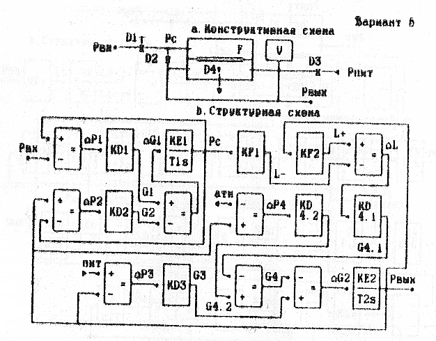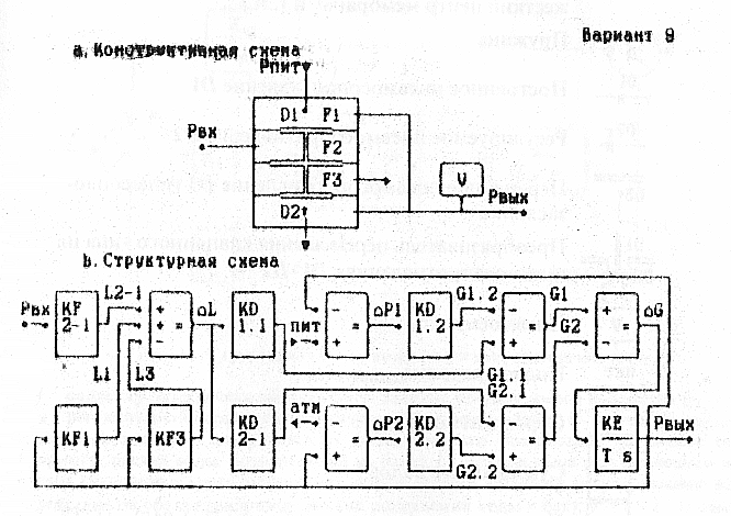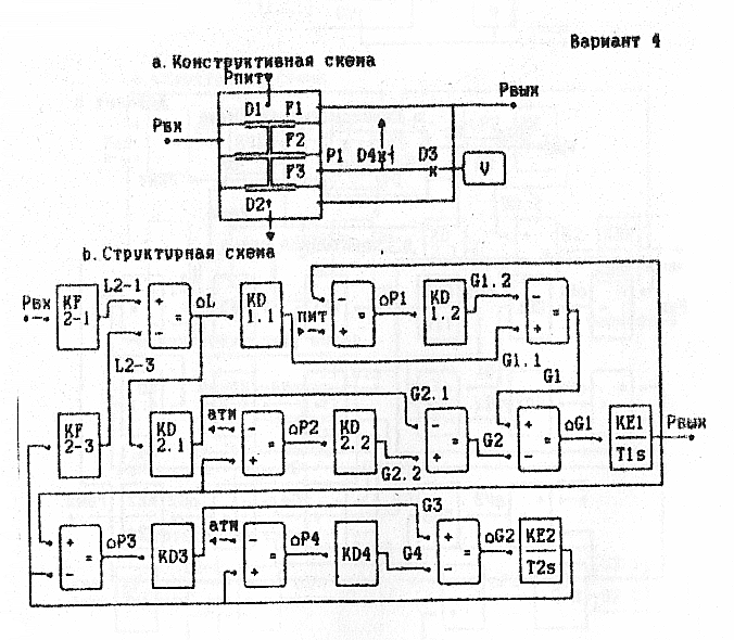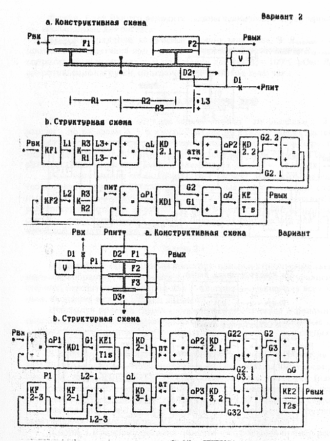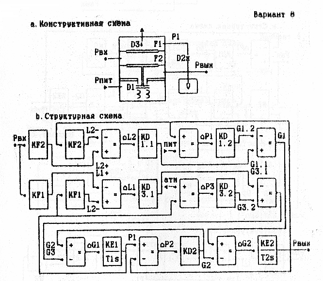На рис. 4 представлена конструкторская схема операционного усилителя на пневмоэлементах. Описание принципа действия прибора см. в разделе 3.2.4 и рис.. 17 в пособии [1]. Условные обозначения на схеме рис. 4 аналогичны обозначениям к задаче 2.1 данного пособия.