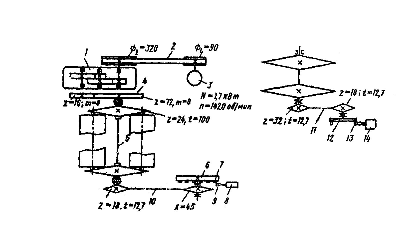 Рис. 5.2. Принципиальная кинематическая схема привода люлечного конвейера расстойного шкафа Т1-ХР-2А: