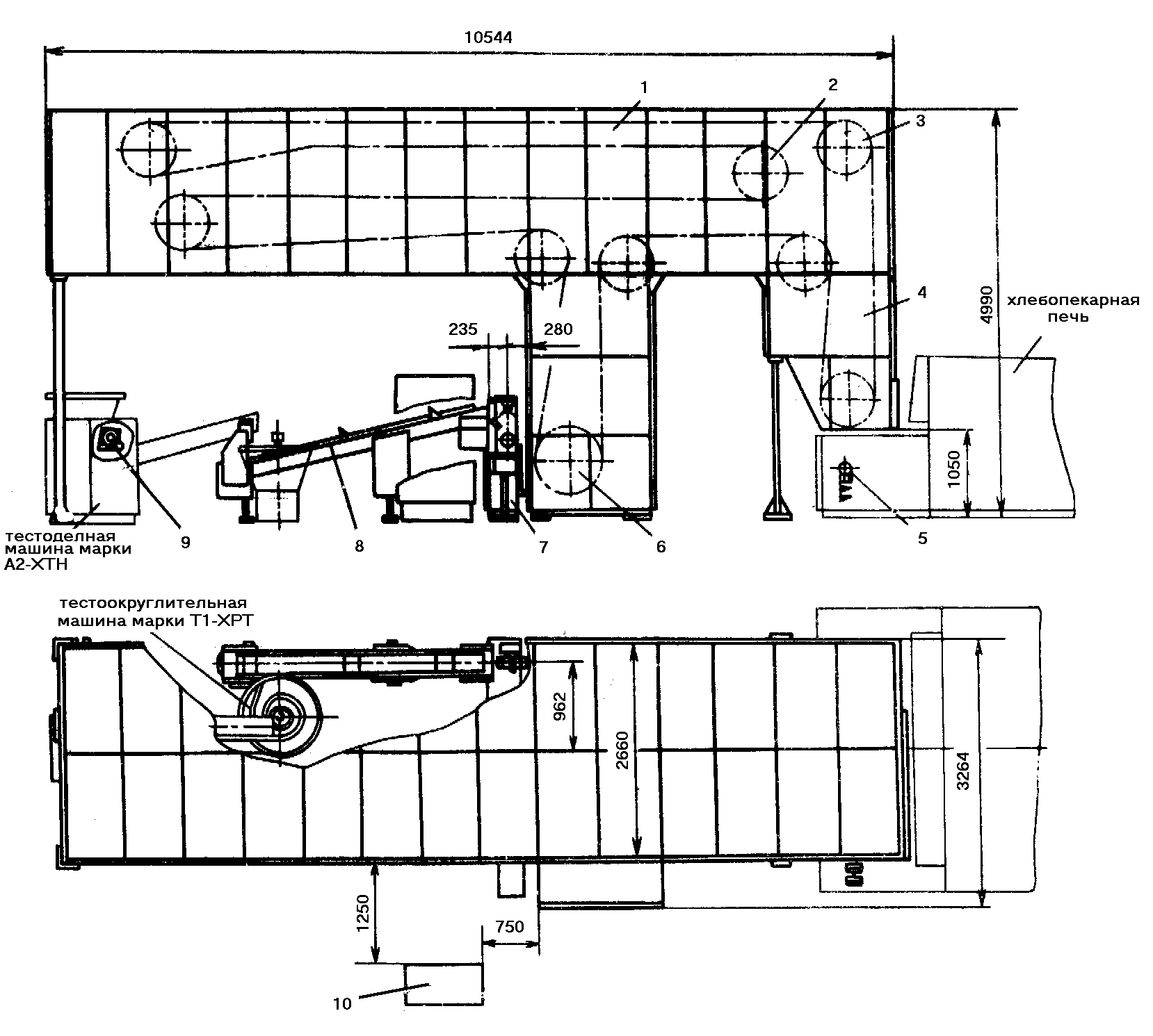 Расстойная камера представляет собой каркас, состоящий из унифицированных секций, внутри которого смонтирован четырехниточный люлечный конвейер. Он состоит из двух параллельных тяговых пластинчато-катковых цепей с шагом 100 мм, охватывающих ведущие 6, поворотные 3 и натяжные 2 звездочки. Через каждые три звена цепи конвейера шарнирно подвешены люльки с восьмикарманными кассетами. Для натяжения цепей предусмотрены натяжные станции.