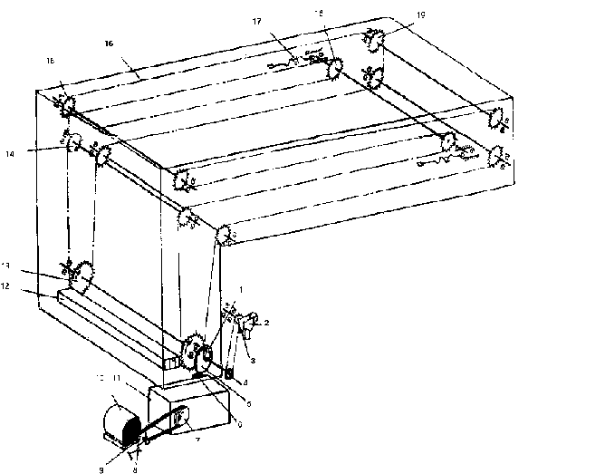 12 – натяжная станция; 13 – направляющие; 14 – вертикальная секция; 16 – звездочки; 17 – приводной вал; 18 – механизм включения; 19 – поверхностные звездочки