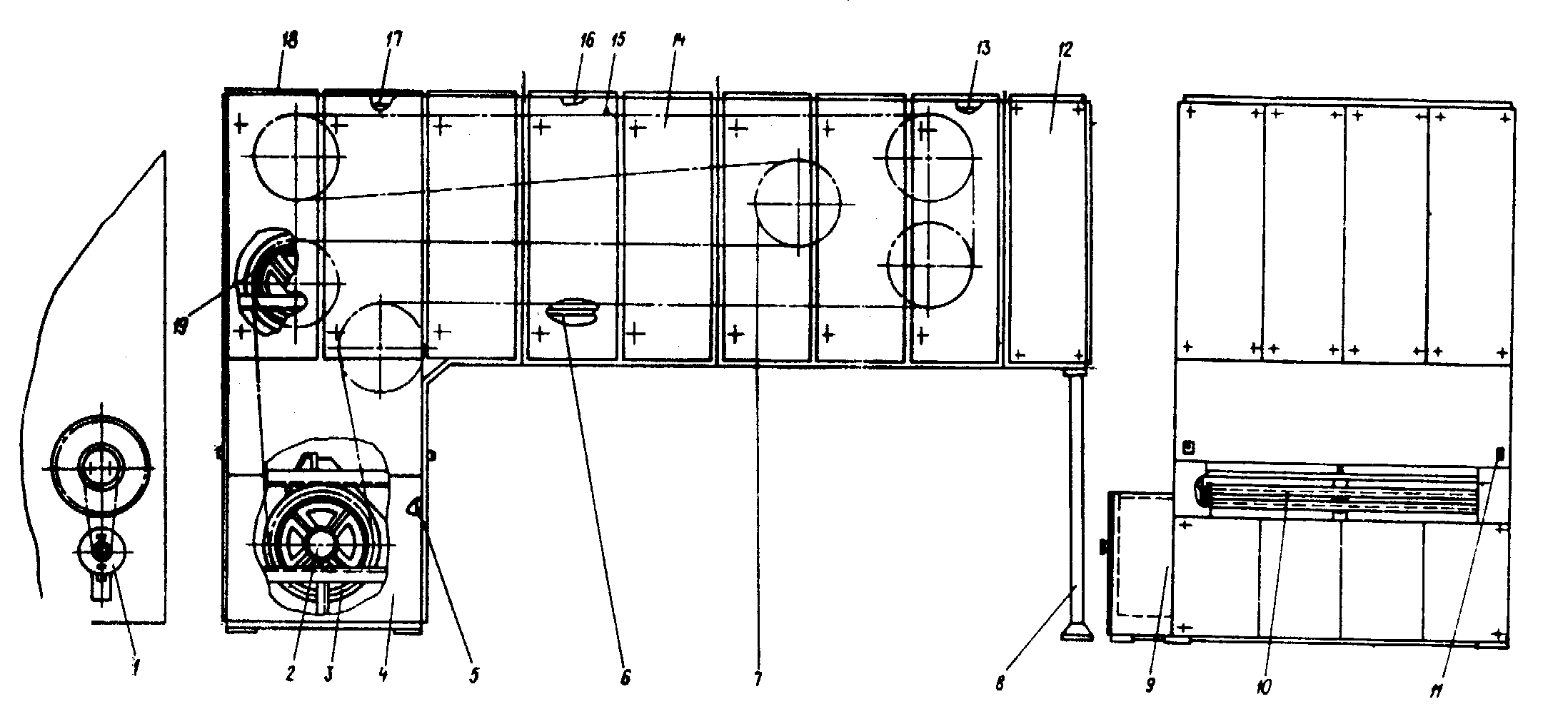 секция; 4 – цепной конвейер; 5 – дверцы; 6 – концевая секция; 7 – кондиционер;