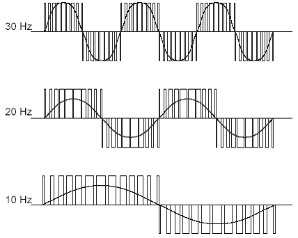 Инверторный блок (блок 4), выполненный на IGBT-модуле, формирует из постоянного напряжения блока 2 трехфазное выходное напряжение посредством широтно-импульсного модулирования (ШИМ). В обмотках двигателя формируется (блок 5) синусоидальный ток соответствующей частоты и напряжения (рис. 3)