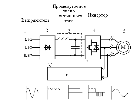 Питание на ПЧ подается от трехфазной или однофазной сети промышленной частоты (1).
