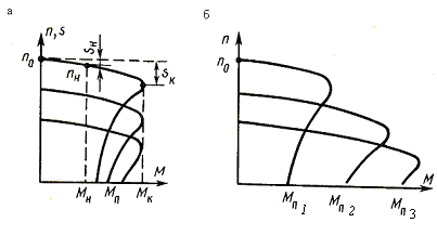а – при регулировании с постоянным моментом; б – при регулировании с постоянной мощностью; Мн, nн, sн – номинальные момент, мощность и скольжение; Мк, sк – критические момент и скольжение; Мп – пусковой момент