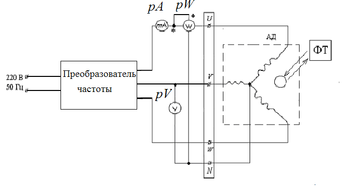 Схема содержит: преобразователь частоты, амперметр рА, вольтметр pV, включенный на линейное напряжение, и ваттметр рW, измеряющий мощность в одной фазе асинхронного двигателя. Асинхронный электродвигатель типа АОЛ 21/4 трехфазный мощностью 270 Вт, напряжением Uн = 220/380 В, величина тока Iн = 1,43/0,83 А, но-минальная частота вращения nн = 1400 об/мин, сos φ = 0,75, КПД η = 66 % .