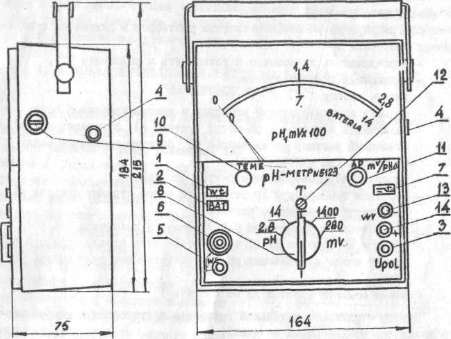 1 – выключатель питания; 2 – кнопка контроля батареи; 3 – гнездо для под-ключения резистора; 4 – заземляющее гнездо; 5 – входное гнездо для электрода сравнения; 6 – входное гнездо для измерительного или комбинированного элект-рода; 7 – переключатель полярности; 8 – переключатель диапазонов; 9 – вороток согласования крутизны характеристики электрода; 10 – вороток температурной компенсации; 11 – вороток АР (установка нуля); 12 – корректор нуля; 13 – выходное гнездо для регистратора (+); 14 – выходное гнездо для регистратора (–)