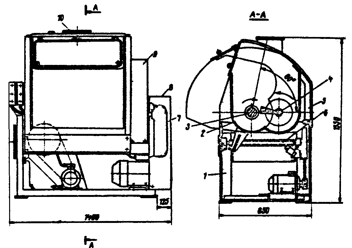 Рис. 13. Общий вид тестомесильной машины Т2-М-63: 1 – станина; 2 – стационарная дежа; 3 – передний вал; 4 – задний вал; 5 – крышка; 6 – механизм поворота дежи; 7 – приводное устройство; 8, 9 – ограждения; 10 – горловина
