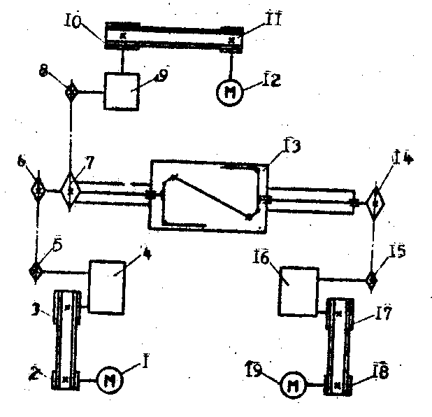 1, 12, 19 – электродвигатели; 2, 3, 10, 11, 17, 18 – шкивы клиноременных передач; 4, 9, 16 – редукторы; 5, 6, 7, 8, 14, 15 – звездочки; 13 – рабочий орган