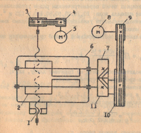 Рис. 14. Кинематическая принципиальная схема тестомесильной машины Т2-М-63: 1 – механизм опрокидывания дежи; 2 – рабочие органы; 3, 4, 9, 10 – шкивы клиноременных передач; 5 – электродвигатель привода механизма опрокидывания; 6 – дежа; 7, 11 – зубчатые колеса; 8 – электродвигатель привода лопастей