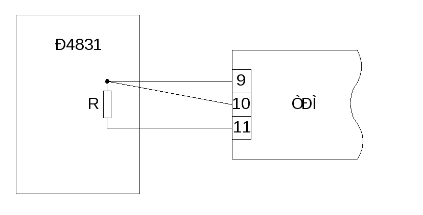 4.1. К входу поверяемого канала прибора вместо термопреоб-разователя сопротивления подключить магазин сопротивлений Р4831. Подключение магазина к прибору производить с помощью трехпроводной линии по схеме подключения (рис. 4). При этом сопротивления соединительных проводов должны быть равными и не превышать 15 Ом.