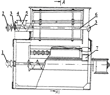 Привод 15 состоит из двухручьевой клиноременной передачи и электродвигателя 16, укрепленного на кронштейне в вертикальном положении. Спиральные лопасти получают вращение от вала шнека через цилиндрические шестерни 5, 6. На корпусе просеивателя установлены кнопки «Пуск», «Стоп» и магнитный пускатель.