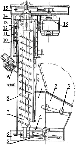 1 – бункер; 2 – крышка; 3 – решетка; 4 – лопасти; 5 – шестерня; 6 – ведущая шестерня; 7 – шнек; 8 – труба шнека; 9 – магнитный уловитель; 10 – сито; 11 – лопасти; 12 – наклонные лопатки; 13 – внешнее сито; 14 – корпус; 15 – приводной механизм; 16 – электродвигатель