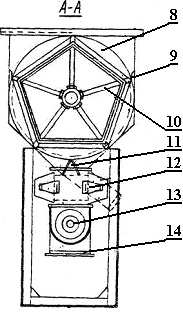 Просеивающее устройство состоит из цилиндрического сита 10 с круглыми отверстиями (для задержания крупных примесей), вращающихся вертикальных лопастей 11 с наклонными лопатками 12 и внешней ситовой рамки 13, образующей со сплошным металлическим листом ситовый барабан. Лопасти приварены к корпусу 14, полукруглая съемная ситовая рамка прикреплена винтовым запором к вертикальным угольникам корпуса машины. Снаружи ситовая рамка закрывается металлическим кожухом.