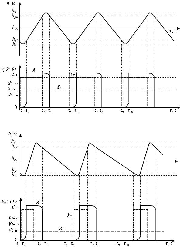 На рис. 3, А, Б представлены графики, определяющие изменение во времени численных значений регулируемого параметра h, м, возмущающего воздействия g2, кг/с, команды формируемой регулято-
