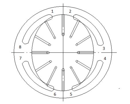 Основными элементами насоса являются ротор, в радиальных пазах которого находятся пластинки и статор. Статор имеет элипсообразную внутреннюю поверхность. При вращении ротора по часовой стрелке на участках 2–3 и 6–7 происходит нагнетание жидкости, т.к. уменьшается объѐм между статором, ротором и пластинками. На участках 4–5 и 8–1 происходит всасывание. Подвод и отвод жидкости осуществляются через окна, сделанные в боковых дисках. Ротационные пластинчатые насосы являются обратимыми машинами, однако они не регулируемы. Работают они при давлениях до 70