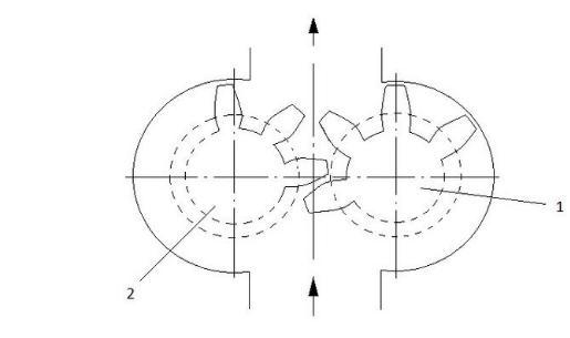 При вращении зубчатых колѐс 1 и 2 шестеренчатого насоса (рис. 45) в направлении, указанном стрелками, жидкость, заключѐнная во впадинах зубьев, выдавливается в полости нагнетания зубьями, вступающими в зацепление, а в полости всасывания заполняет впадины между зубьями, освобождающихся при выходе зубьев из