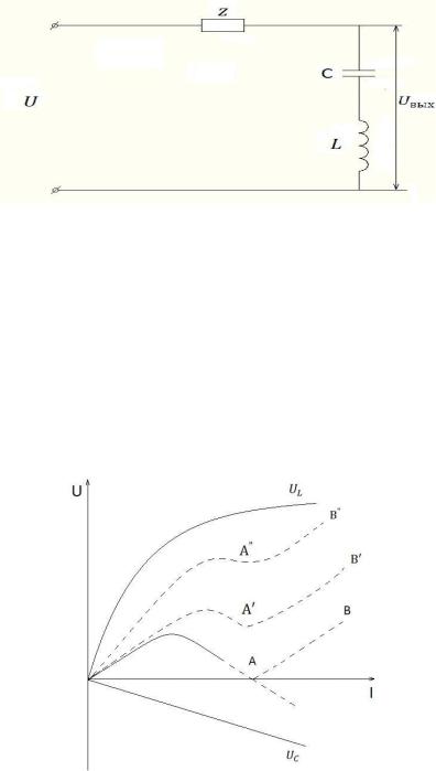 Рассмотрим один из схемных вариантов феррорезонансного реле с последовательно соединѐнными С, L, zн и выдвинем предположение чисто реактивного характера контура (zн = 0). По вольтамперным характеристикам UL = f(I) и UС = f(I) строим вольтамперную характеристику контура (рис. 15). При I = I1 наступает резонанс напряжений и при дальнейшем увеличении тока Uz меняет фазу на 180o, но это не влияет на наши рассуждения, так как рассматриваются эффективные значения тока и напряжений.