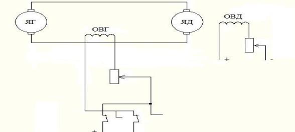 Изменяя ток возбуждения и, следовательно, ЭДС генератора, можно регулировать скорость вращения якоря двигателя ЯД.