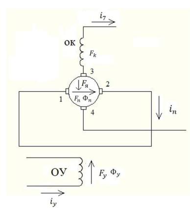 дать по направлению с еП и определяться еѐ значением, сопротивлением обмотки якоря и переходным сопротивлением щѐток 1, 2. Созданная этим током МДС FП вызовет магнитный поток реакции якоря ФП направленный по оси щѐток 1, 2 (поперечный магнитный поток) перпендикулярно магнитному потоку Фу. Поток ФП будет индуцировать в проводниках якоря ЭДС еэ (выходная величина), направление которой обеспечивает максимальное еѐ значение на щѐтках 3–4. При подключении к этим щѐткам внешней нагрузки в обмотке якоря и внешней цепи потечет ток iэ. Этот ток, протекая по обмотке якоря, создаѐт магнитодвижущую силу (МДС) Fя, направленную по продольной оси навстречу МДС Fу обмотки управления ОУ.