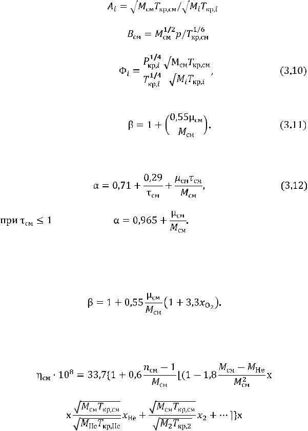 Для всех неуглеводородов принимается n = 1, а для полярных молекул, не содержащих атомы водорода, μ = 0. Уравнения (3.7)– (3.14) позволяют вычислять вязкость смесей: неполярных газов, неполярных и полярных газов, полярных газов, а также смесей, содержащих кислород и гелий. Для расчета необходимо знать молекулярные массы компонентов, критические температуры, давления и дипольные моменты индивидуальных газов, составляющих смесь.