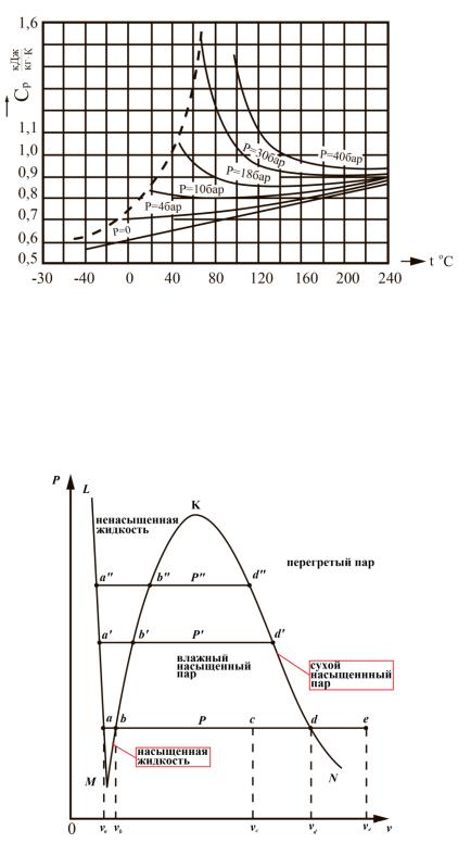 приводит к увеличению теплоемкости. Это положение иллюстрируется рис. 7 для перегретого пара хладагента R22. Пунктиром показана линия насыщения.