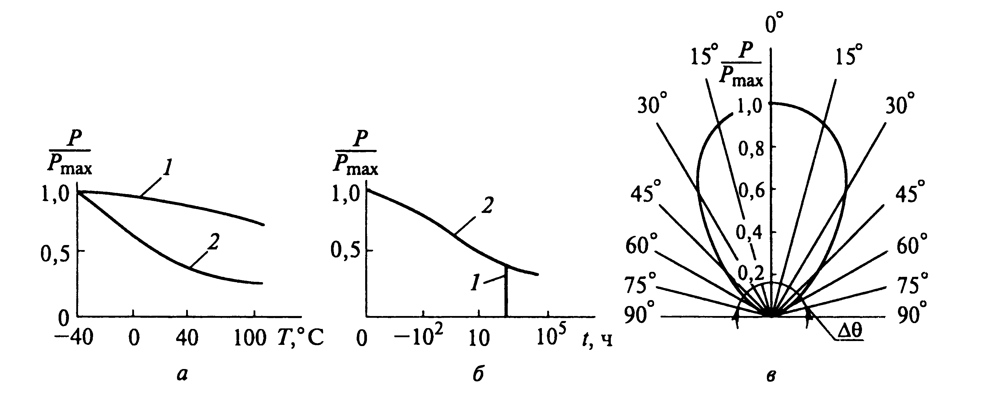 Направленность излучателя представляет собой свойство концентрации излучаемой мощности в относительно малом телесном угле. Диаграмма направленности (в) характеризует зависимость мощности излучения от угла θ. Угол θ обычно выбирают из условия P / Pmax ≥ 0,8.
