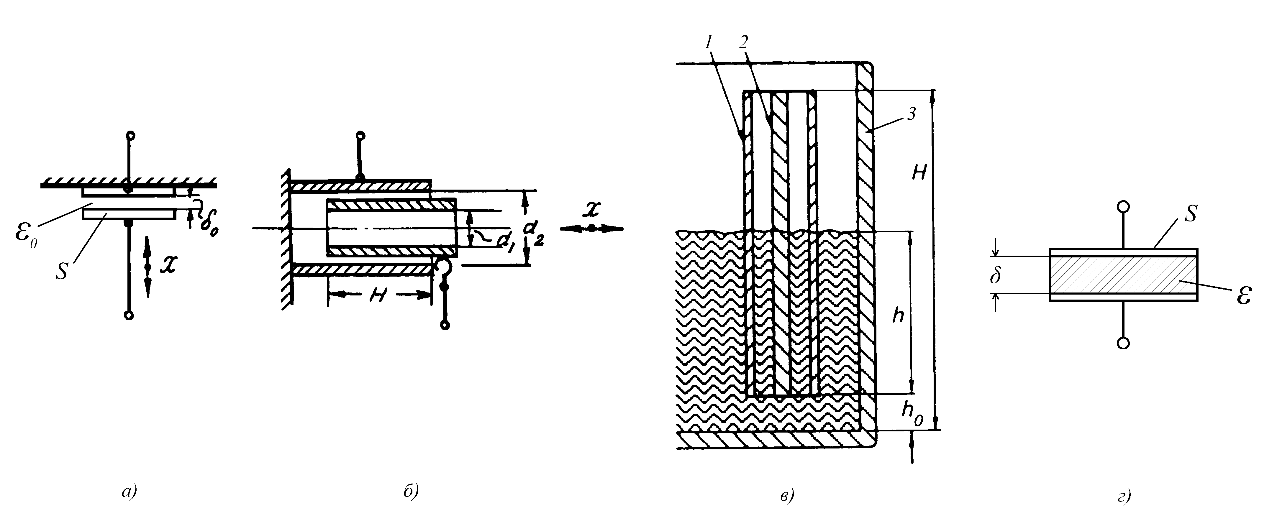 Емкостные ЧЭ основаны на зависимости электрической емкости конденсатора от размеров, взаимного расположения его пластин и от диэлектрической проницаемости среды между ними. Емкость плоского конденсатора определяется по формуле: