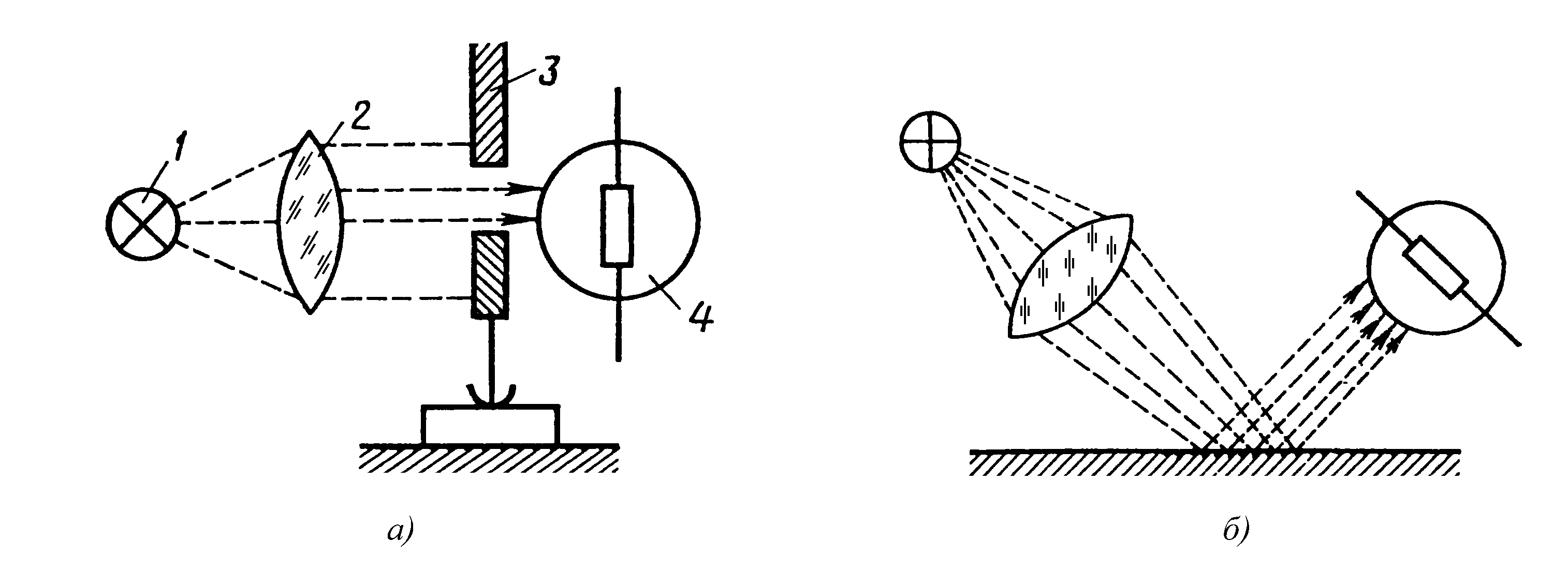 Во второй схеме измерения (б) световой луч отражается от объекта измерения и в зависимости от отражательных свойств объекта изменяется сигнал, получаемый от светоприемника.
