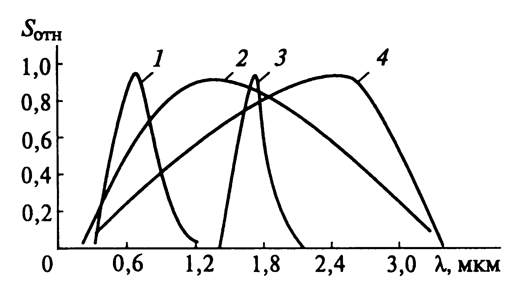 Рис. 2.49. Спектральные характеристики фотодиодов на основе германия (1), свинца (2), кремния (3) и индия (4).