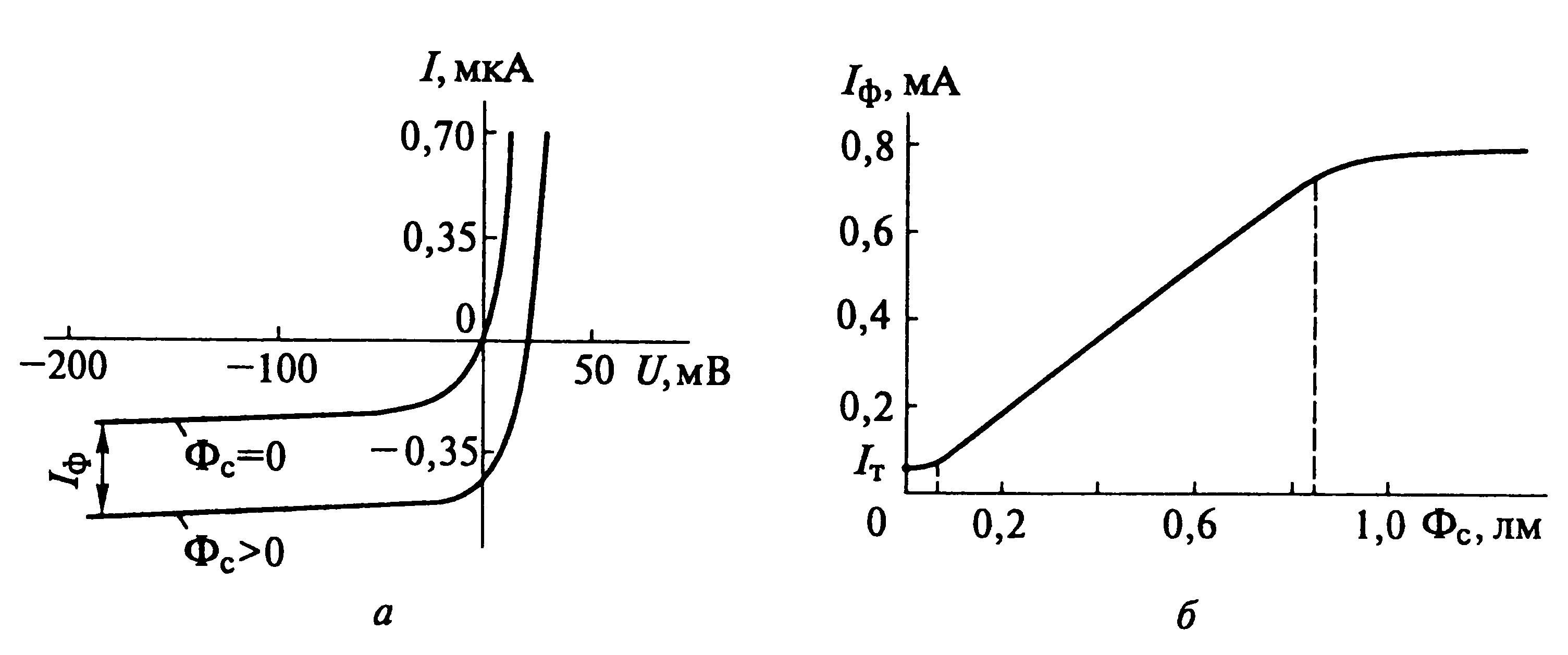 При освещении выпрямляющего p-n перехода световым потоком Фс происходит генерация избыточных носителей и обратный ток фотодиода возрастает на величину Iф, называемую фототоком (рисунок 2.47). Обратное смещение перехода составляет 10..30 В. Фотоприемники изготавливаю на основе германия, кремния, свинца, индия, они имеют линейную функцию преобразования.