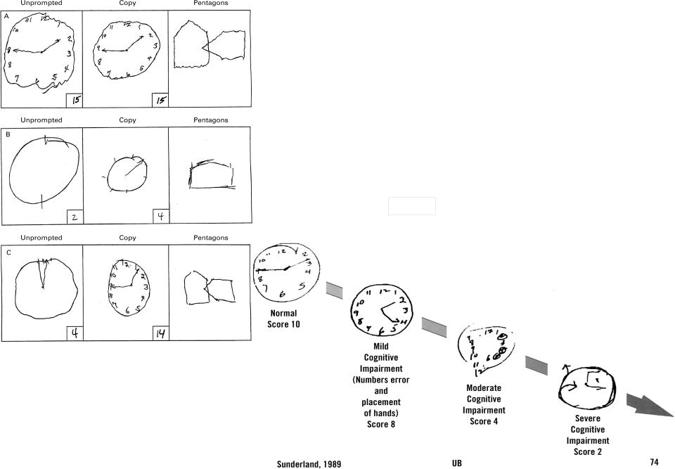 • Исследователь дает пациенту заранее нарисованный круг просит расставить цифры, как на циферблате часов, затем просит обозначить стрелками время 13 часов 45 минут.