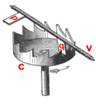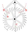 Спуск Грахама[5]. Показано: (a) - спусковая шестерня (b) - лопатки, показаны концентрические блокирующие поверхности (c) - стойка маятника.
